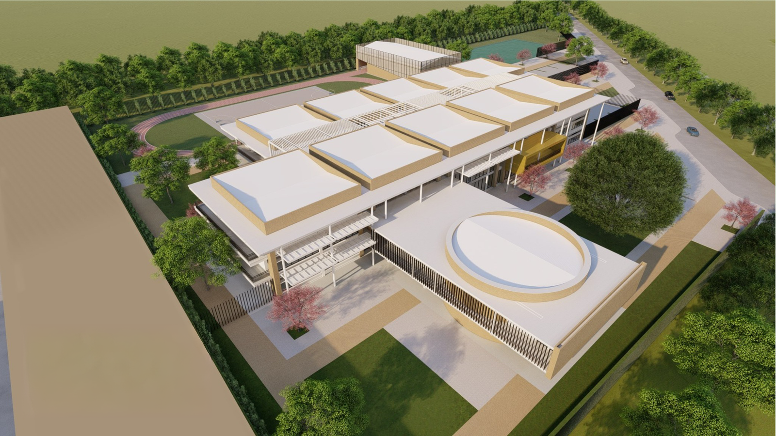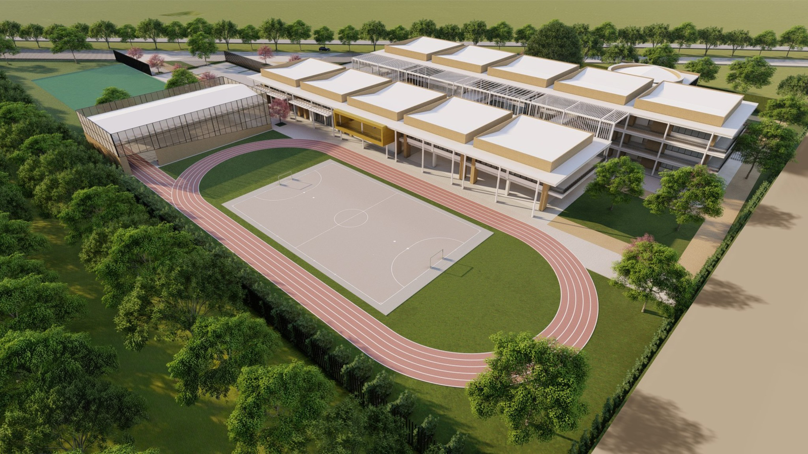Gimnasio, sede deportiva múltiple, campo deportivo con pista atlética reglamentaria, reservorio de agua y diseño con criterios ambientales.